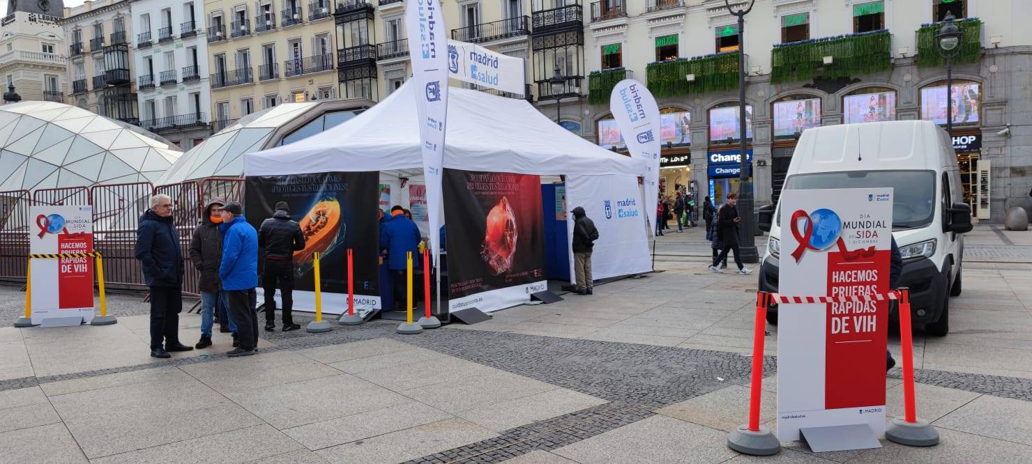 Madrid Salud realiza hoy pruebas rápidas del VIH en la carpa instalada en la Puerta del Sol, pero todos los días ofrece este servicio todos sus Centros Comunitarios (CMSc) y en todos los Centros de Atención a las Adicciones (CAD). El laboratorio municipal de Análisis Clínicos realiza actualmente unas 10.000 pruebas anuales de VIH.