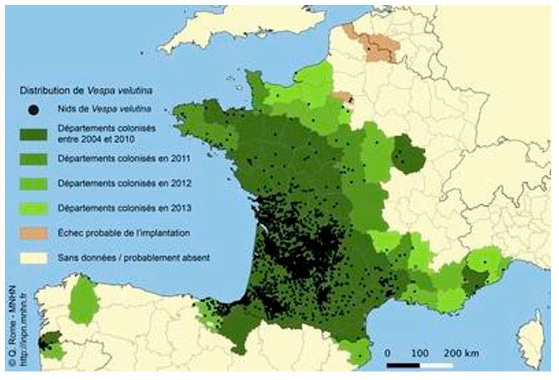 Distribución y evolución temporal en los diferentes departamentos del SO de Francia y España. Fuente: Quentin Rome. Museo de Historia Natural. Paris-Francia.