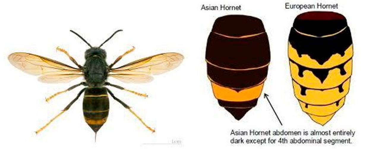 Vespa velutina nigrithorax (izda) y diferencia (patrón morfológico segmentos abdominales) entre esta especie y su homólogo europeo Vespa cabro