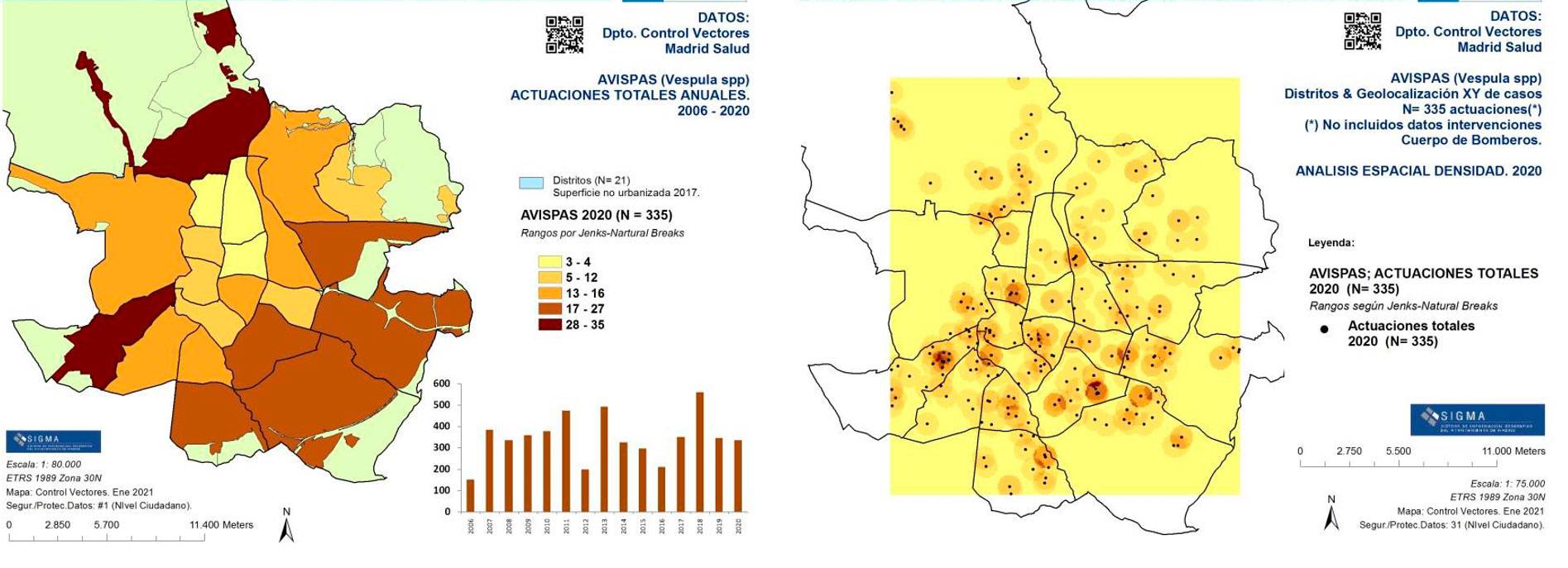 Actuaciones de Madrid Salud (Dpto. Control Vectores) relativos a intervención en caso de incidencias comunicadas o avisos por avisperos (datos actualizados 2020). Estas intervenciones se refieren a casos implicando especies autóctonas españolas. Hasta la fecha, los servicios municipales de Madrid no han detectado la presencia de Vespa velutina. Los datos disponibles se encuentran georreferenciados (se presentan agrupados a escala de Distrito, lo que permite el seguimiento y análisis espacial de los casos.